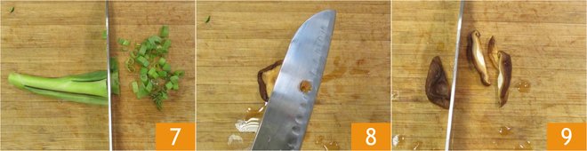 Thinly slice the spring onion stalk 7. Finally, drain the mushrooms, remove the stalk 8, and cut the upper part into strips 9.