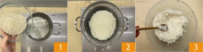 To prepare the rice dumplings, start by boiling the rice in a pot with plenty of salted water as desired, for about 12 minutes 1. After this time, drain the rice 2 and let it cool in a bowl in the refrigerator 3; you can cover with plastic wrap.