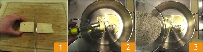 To make the rice flan in a pan, first cut the fontina into thin slices (remove the rind) 1. In a large pot with high sides, pour a drizzle of oil 2, the rice 3,