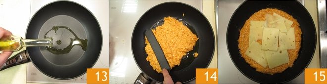 Now in a non-stick pan with a base diameter of 8.5 inches and a surface diameter of 11 inches, pour a drizzle of oil 13 and start putting about half of the rice in the pan, spread it with the help of a spatula so that it is well distributed on the bottom of the pan 14. Now place the fontina in the center of the rice 15