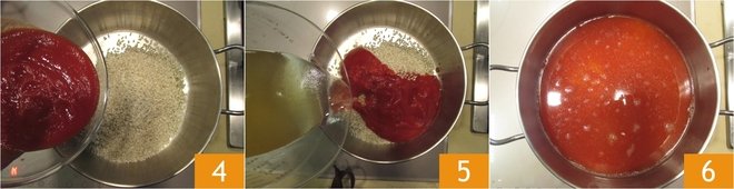 add a pinch of salt, the tomato sauce 4, the broth 5, bring to the heat and start cooking 6. Stir often and cook for about 17 minutes (times may vary depending on the quality of the rice, Carnaroli cooks in 15-18 minutes).
