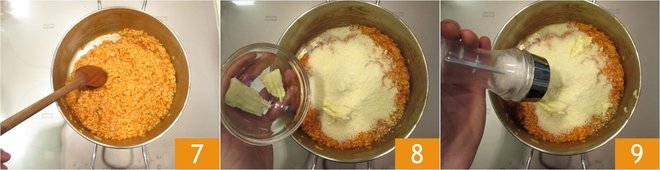 When cooking is finished, the rice should be dry 7, let it rest for two minutes. After resting, start the creaming: add parmesan, the butter 8, adjust salt 9 and pepper
