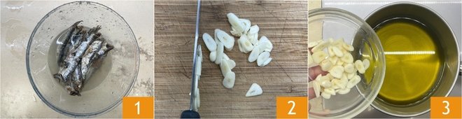 After the soaking time, open the anchovies in half and remove the bone and tail 4. Add the anchovies to the saucepan 5 and cook for about an hour over very low heat; the oil should not fry 6. In the meantime, prepare the vegetable broth that you will use to cook the rice.