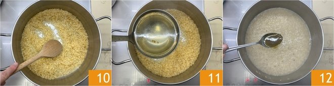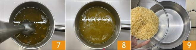 Once ready, blend the bagna cauda with an immersion blender 7 and set aside 8. Pour the rice into a hot saucepan, without adding fat 9.