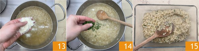 At the end of cooking, adjust the salt, then turn off the heat and stir in the grated Parmigiano Reggiano DOP 13. Mix well, then also add the chopped curly parsley 14. Transfer the risotto into a baking dish, level the surface 15, and cover with plastic wrap. Place in the refrigerator until completely cooled.