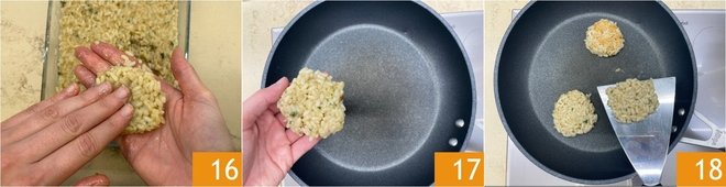 When the rice is cold, take small portions and compact them between your palms to obtain the shape of a medallion; with these quantities, you will get about 8 16. Place the rice medallions in a well-heated non-stick pan 17 and let them brown over medium-high heat without touching them. Once golden on one side, gently turn them with a spatula 18.