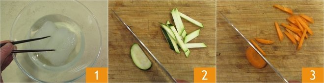 To make rice noodles with meat and vegetables, first soak the rice noodles in plenty of warm water for about 30 minutes 1. Meanwhile, prepare the rest of the ingredients: cut the zucchini 2 and carrots into strips 3.