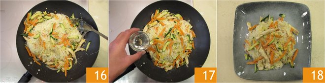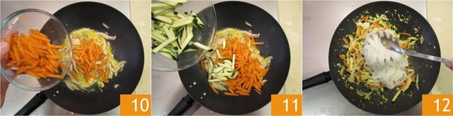 Add the carrots 10 and zucchini 11 and cook for a minute and a half. At this point, drain the rice noodles and transfer them to the wok 12.