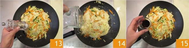 Season with salt, pepper 13, and rice wine 14. If you wish, you can also add soy sauce at this point: the important thing is to do it during cooking and not on the finished dish 15.
