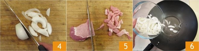 Also cut the onion 4 and pork loin 5 into strips. Heat 5 tablespoons of vegetable oil in a wok over high heat, then add the onion 6.