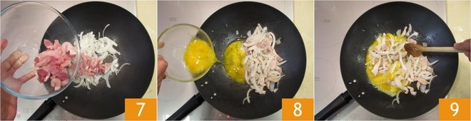 Add the meat 7 and brown for 30 seconds. Move the meat and onions to one side and pour in the beaten eggs 8. Keep stirring for 30 seconds, tossing everything 9.