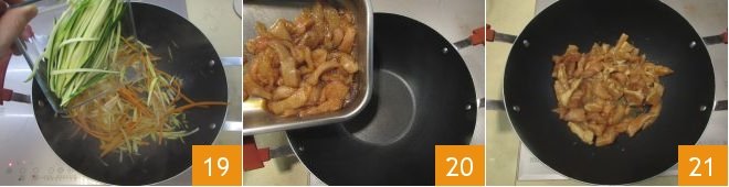 and also cut it into slices and then into strips 16; in a wok or a high-sided non-stick pan, pour the vegetable oil and heat it slightly, then add the ginger and leek first 17, then add the carrots and drizzle with soy sauce. Stir and cook over high heat for 2 minutes.