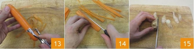Trim and peel the carrot with a vegetable peeler 13, cut it into slices also with a mandoline and each slice into sticks 14; peel the ginger 15