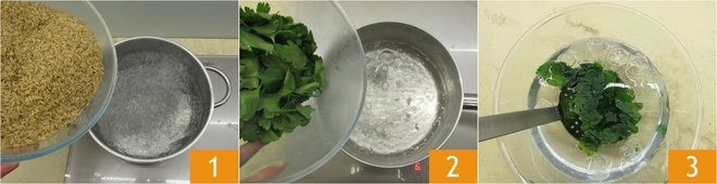 To prepare the Rice pie with peas, asparagus, and zucchini, boil the brown rice in salted boiling water 1, following the cooking times indicated on the package. Meanwhile, in another small pot, blanch the parsley for 20 seconds 2 and then drain it in a bowl with ice water 3.