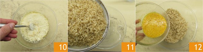 Also add the Parmesan cheese 10 and mix to combine. Drain the rice in a bowl 11 and let it cool for a few minutes, then add the egg mixture 12 and mix well.