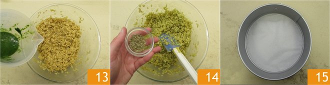 Also add half of the parsley oil 13 and dried marjoram 14. Line the bottom of a 7.5-inch springform pan with parchment paper 15.
