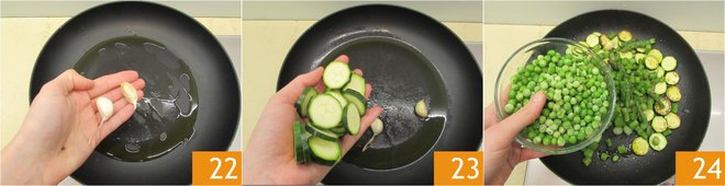 In a pan, pour a drizzle of oil and two unpeeled garlic cloves 22, sauté over medium heat for a few minutes. Pour the zucchini into the pan 23, also add the asparagus and the peas 24 and cook for 10 minutes, stirring occasionally, so that the vegetables become well browned.