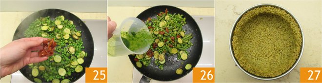 Also add the tomatoes 25. When the vegetables are cooked but still crunchy, turn off the heat, remove the garlic, adjust the salt if necessary, and season with the remaining parsley oil, mix, and set aside. When the base is cooked, remove it from the oven 27, let it cool.
