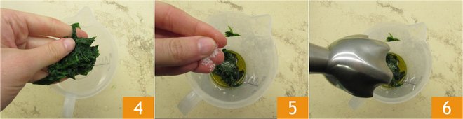 Squeeze it and place it in a tall glass 4, add the oil and a pinch of salt 5, blend with an immersion blender 6.