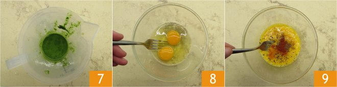 You should obtain a very green sauce 7. In a bowl, mix the eggs with a fork 8, a pinch of cumin, a pinch of hot paprika, a pinch of salt, and pepper 9.