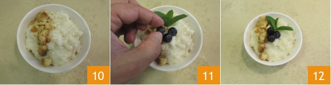 Distribute them on each bowl of rice pudding 10, garnish with some blueberries 11, fresh mint leaves, and serve 12.