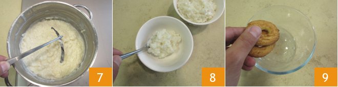 The result should be creamy, and the rice should be cooked. Remove the pod 7 and pour the rice pudding into 4 bowls, each with a diameter of 4.75 inches and a height of 2.75 inches 8. Make sure to pour the rice while it's still hot. Let it cool at room temperature, then transfer to the fridge until it sets, about 2 hours. Once this time has passed, crumble the cookies coarsely with your hands 9.