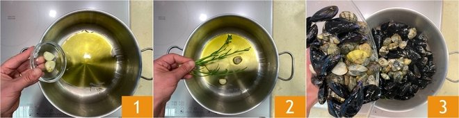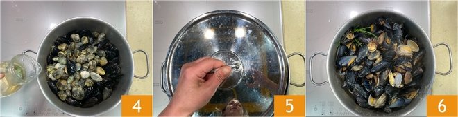 Deglaze with white wine 4 and cover with a lid 5. Let them cook for a few minutes over medium-high heat until they open up 6.