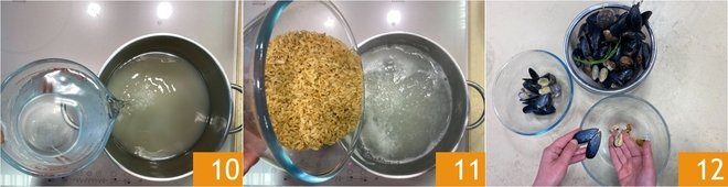 Pour the strained liquid into a pot and dilute it with water, bring to a boil without adding salt. When it boils, cook the brown rice 11 for the time indicated on the package. In the meantime, shell the mussels and clams 12, keeping some with shells for plating.