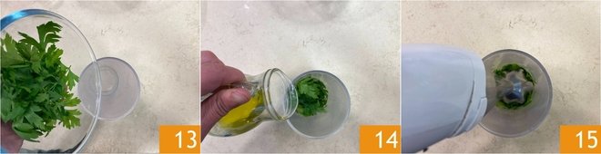 Place the parsley leaves in a tall glass 13, add the oil 14. Blend to obtain a creamy pesto 15.