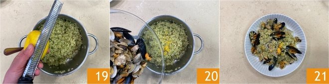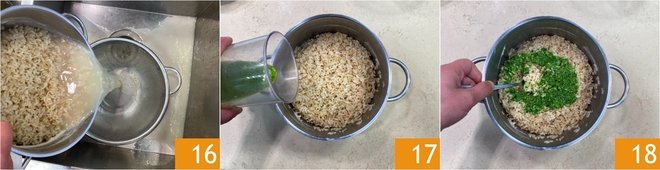 When cooking is finished, drain the rice 16 and season it with the pesto 17, stir to flavor 18.