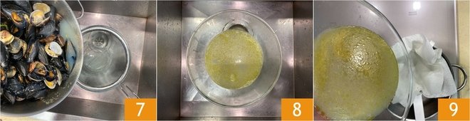 Drain the seafood 7, keeping their liquid 8. Strain it with a paper kitchen towel to remove any impurities 9.