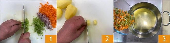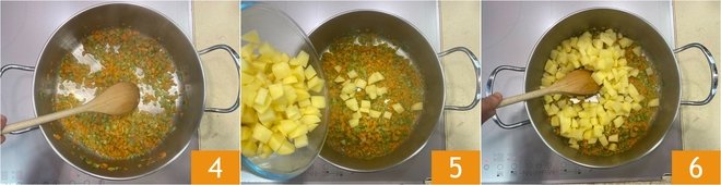 Sauté gently for about 10 minutes 4, then add the potatoes 5 and stir 6.