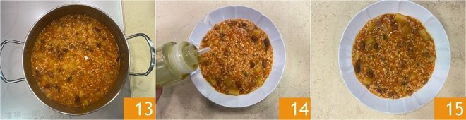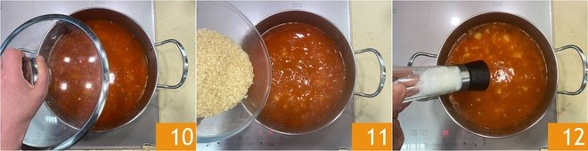 Cover with a lid 10 and cook over medium heat for 20 minutes. After the cooking time, add the rice 11 and stir, then adjust the salt 12. Cover with the lid and let it cook for another 10 minutes, stirring occasionally.