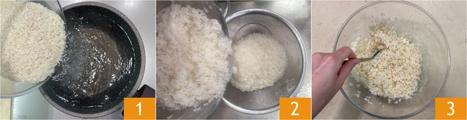 To make the rice tabbouleh salad, bring a pot of water to a boil, then add salt and cook the rice for the time indicated on the package 1. Once cooked, drain the rice 2 and transfer it to a bowl 3. Allow to cool.