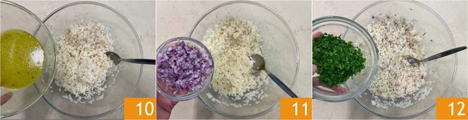 Take the bowl with the rice and season with the citronette 10, then add the onion 11 and chopped parsley 12.