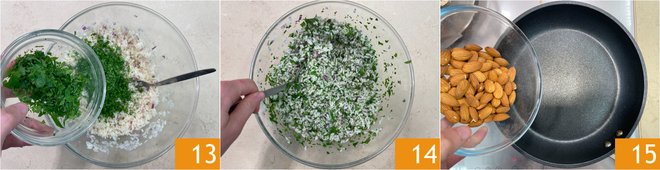 Also add the chopped mint 13 and mix everything well 14. Finally, toast the almonds in a non-stick pan over medium heat, being careful not to burn them 15.