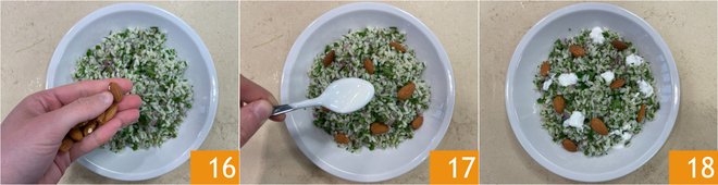 Plate the seasoned rice and garnish with the toasted almonds 16 and a few dollops of yogurt 17. Your rice tabbouleh salad is ready to be served 18!