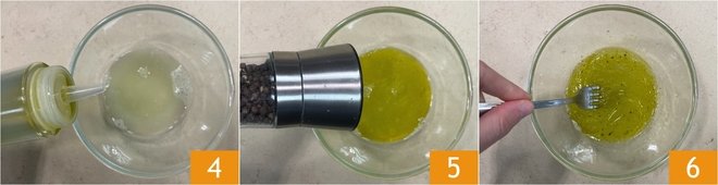 Meanwhile, prepare the citronette: squeeze the lemon juice into a small bowl, then add oil 4, salt, and pepper 5. Stir to emulsify 6.