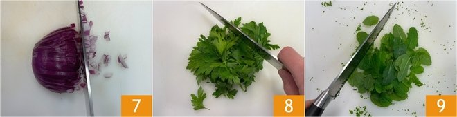 Clean and dice the onion into a brunoise, which means very small cubes 7. Finely chop the parsley 8 and mint 9, which you have previously washed and dried.