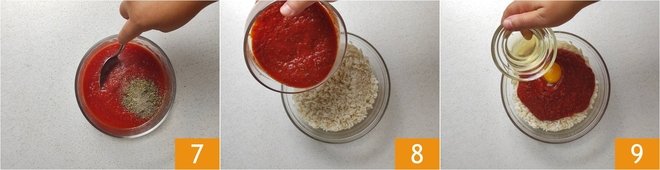 Meanwhile, slice the scamorza cheese 4 and in a bowl, season the tomato sauce with salt 5, oregano 6, and pepper.