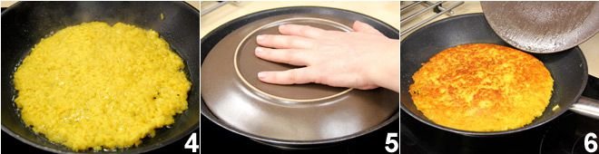 Fry the rice over moderate heat for at least 5 minutes 4 (the rice should become reddish), then place a lid (or a plate) on top of the pan 6 and flip everything upside down. Let the rice disk slide from the lid back into the pan and then fry it for another 5 minutes on the other side, until it becomes golden brown. As you prepare each fried rice disk, place them on a plate and keep them warm in the oven at 140°F. Once all 4 disks are ready, serve them sprinkled with a tablespoon of grated Parmesan cheese.