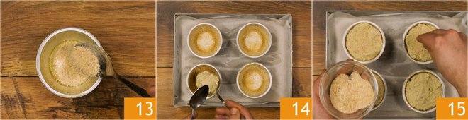 Incorporate 80 g of grated cheese 10 and the eggs 11, season with salt and pepper, and mix to combine the dough. Take 4 individual molds about 3 inches in diameter, grease the bottom and the edge with oil 12.