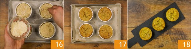 Finish by sprinkling the remaining cheese on top 16. Bake in a preheated static oven at 375°F for 30 minutes or until well browned. Unmold the ricotta and artichoke flans 17 and serve them warm 18.