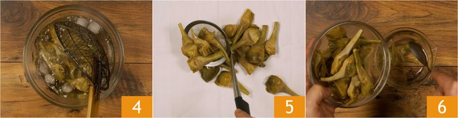 Drain them and transfer them to a bowl with cold water 4 to stop the cooking. At this point, drain the artichokes and dry them with a cloth 5, then place them in a tall glass 6.