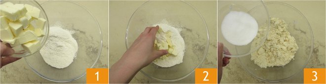 To prepare the ricotta and blueberry tart, start with the crust preparation. Pour the cold butter with the flour into a bowl 1, pinch it quickly with your fingers 2 to avoid warming it too much. You should obtain a sandy mixture. At this point, add the sugar 3 and work it for a few moments.