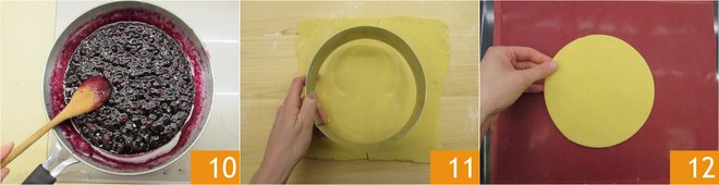 When the blueberries have softened and the compote begins to thicken, turn off the heat and add the lemon juice, mix 10 and set aside. Butter and flour a 7-inch ring mold. Take the crust, roll it out to about 3/16 inch thick, and cut it with the mold 11. Place the cut crust on a baking sheet lined with a silicone mat (or simple parchment paper) 12.