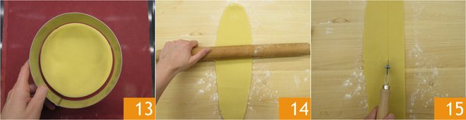 Also position the mold 13. With the leftover dough, create the edge: roll it out 14 and cut a strip 1.5 inches wide and the length of the ring (about 23.5 inches) 15.