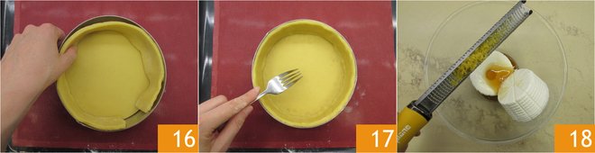Place the strip of crust adhering it well to the ring 16 so that it doesn't wrinkle during baking. Poke the base of the crust with a fork 17 and let it cool in the refrigerator for at least 30 minutes. Prepare the filling: in a bowl, mix together the ricotta, honey, and lemon zest 18.