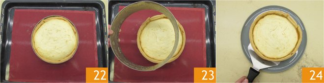 Bake in a preheated static oven at 350°F for about 45 minutes. Once baked, let it cool, remove the ring 23, and transfer to the serving plate 24.