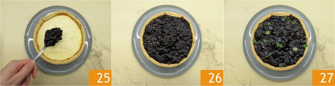 Pour the quick blueberry compote 25 26 and decorate with more fresh blueberries and fresh oregano leaves. The ricotta and blueberry tart is ready to be served 27.